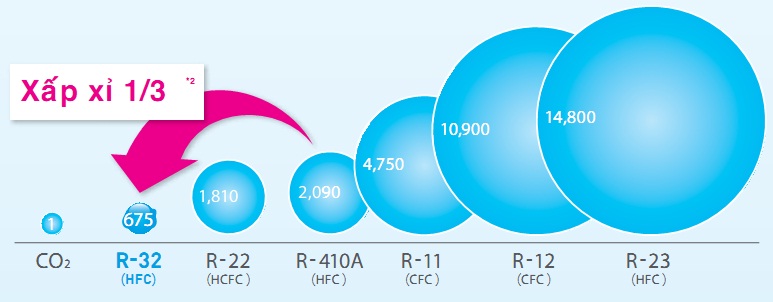 - Gas R32 đạt được tiêu chuẩn cao trong việc chống sự gia tăng nhiệt độ do hiệu ứng nhà kính.