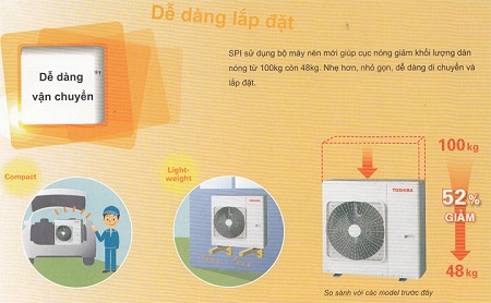 SPI sử dụng bộ máy nén mới giúp cục nóng giảm khối lượng dàn nóng từ 100kg còn 48kg. Nhẹ hơn, nhỏ gọn, dễ dàng di chuyển và lắp đặt.